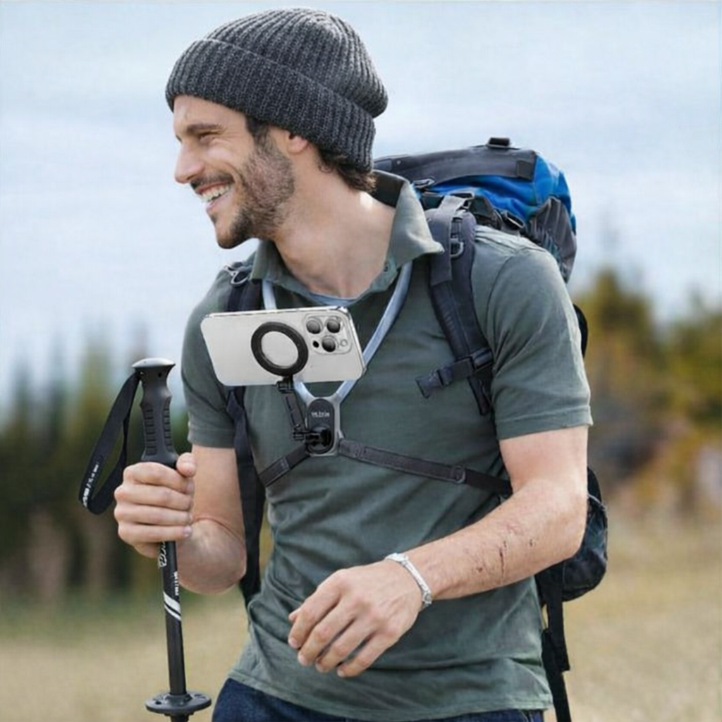 With this extra-large MagSafe neck mount, you can film comfortably from your perspective. Ideal for hiking, cycling, vlogging, and navigation on the go.