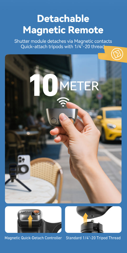 The grip features a detachable Bluetooth shutter button. This allows you to easily take photos and start or stop videos from a distance. This is ideal for group photos, selfies, or shots where you cannot be close to your phone.
